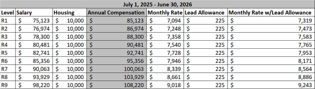 | Level | Salary | Allowance | Annual Compensation | Monthly Rate | Chief Allowance | Monthly Rate w/ Allowance | |